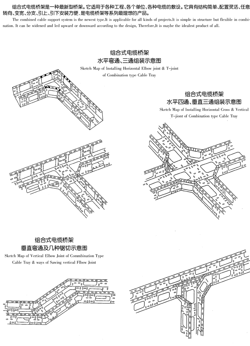 组合式电缆桥架是一种最新型桥架。它适用干各种工程、各个单位、各种电缆的敷设。它具有结构简单、配置灵活、任意转向、变宽、分支、引上、引下安装方便,是电缆桥架等系列最理想的产品。